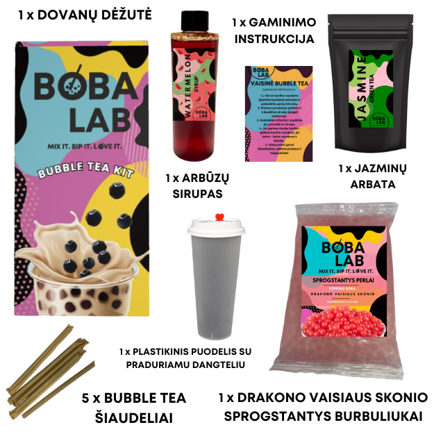 ARBŪZŲ VAISINĖS BURBULINĖS ARBATOS RINKINYS SU DRAKONO VAISIAUS SPROGSTANČIAIS PERLAIS