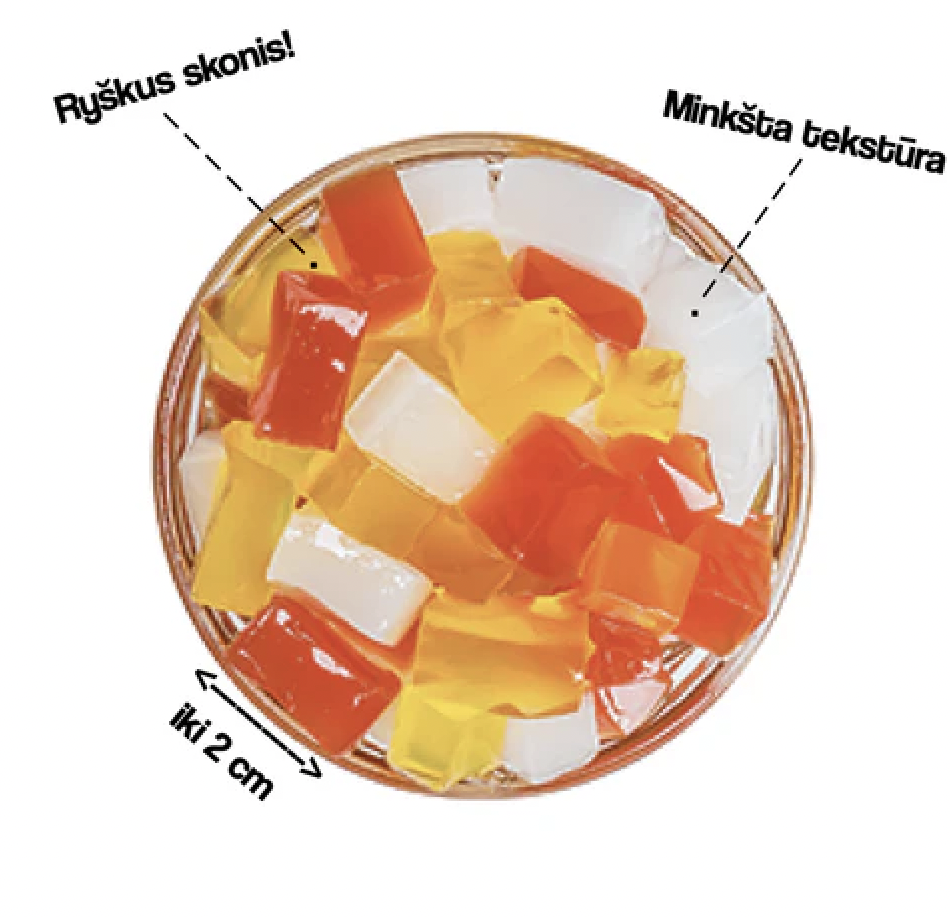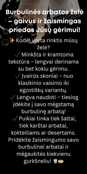 Atraskite burbulinės arbatos želė – lengvą, gaivią ir skanią alternatyvą tradiciniams burbuliukams! Švelnios ir elastingos tekstūros želė puikiai papildo įvairius gėrimus, suteikdama jiems unikalų skonį ir smagų kramtomą pojūtį.