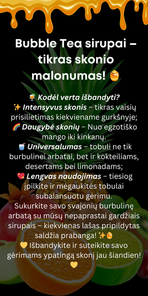Burbulinės arbatos sirupai pagaminti iš tikrų vaisių tyrės / minkštimo ir natūralių augalinių dažiklių. Tobulas pasirinkimas pagardinti Jūsų burbulinę arbatą!
